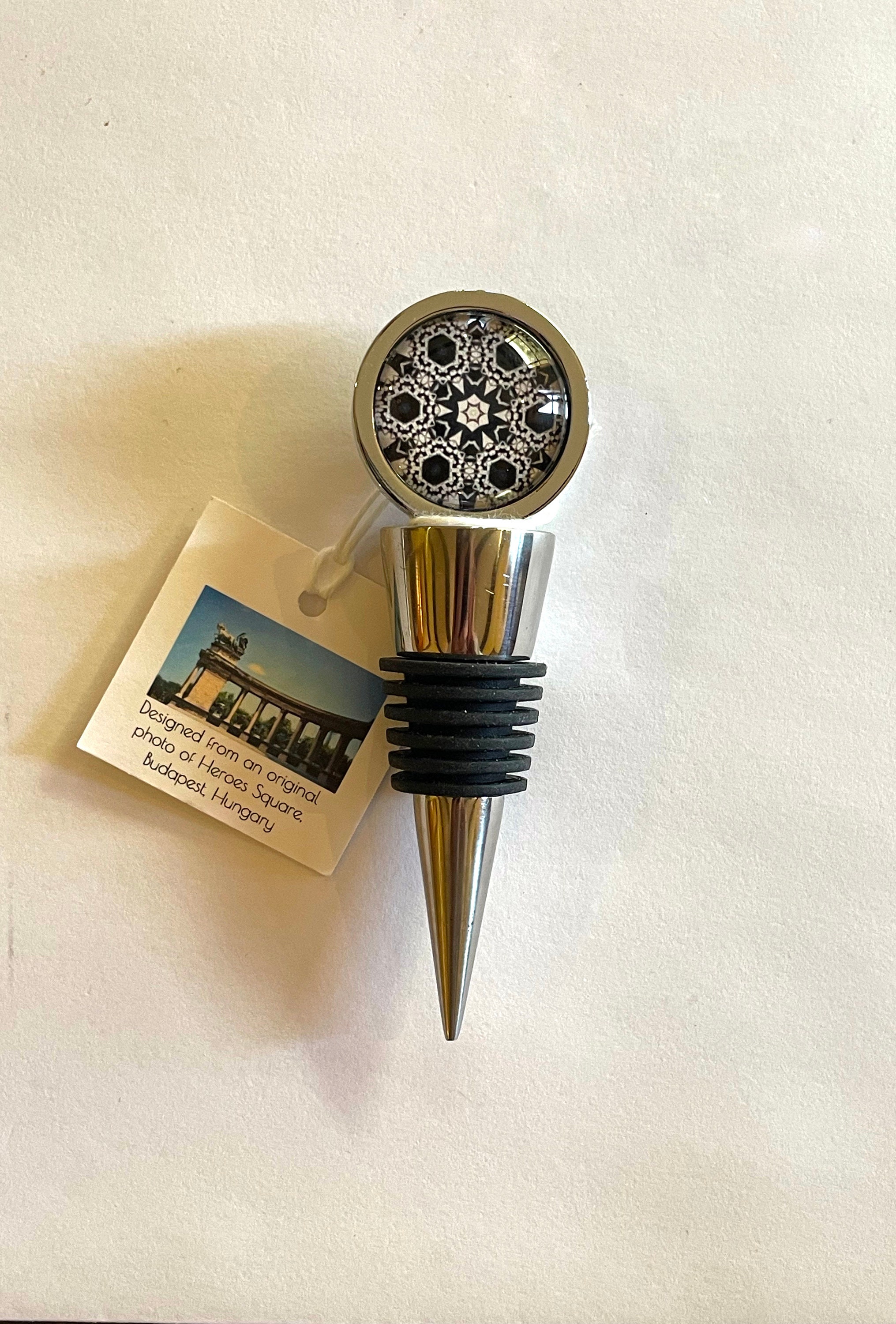 Distinctive Wine / Bottle Stopper with sophisticated original design set in glass, atop crafted stainless steel base. Both sides of stopper contain design, so they are eye-catching from any direction.