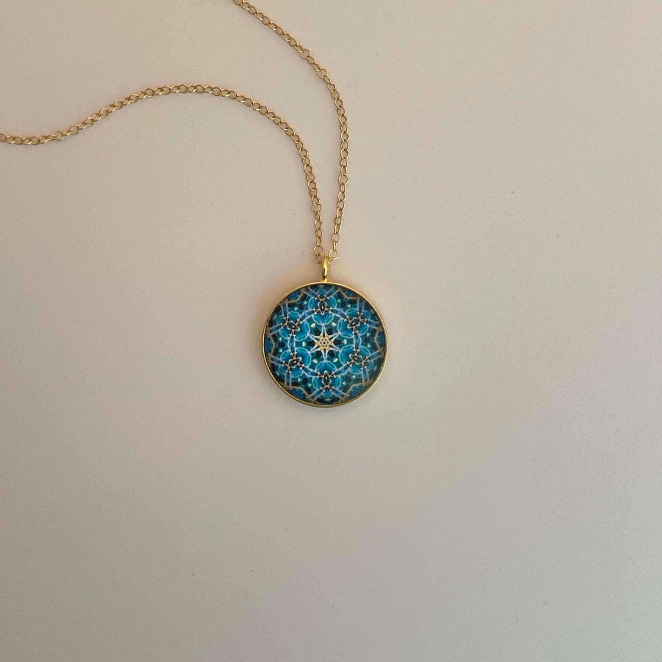 Stunning, glass .75" diameter pendant set in gold-plated bezel on 16" - 18" adjustable, gold-filled necklace. This statement piece is truly a work of art. The design was created from an original photo of Ana's azalea garden.