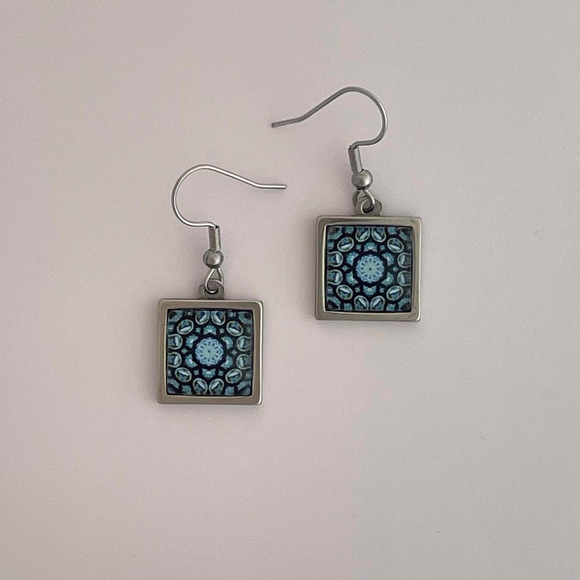 Earrings are approximately .5" square glass and steel charms on steel french hooks. They are lead-free, nickel-free and hypoallergenic. They are very light weight and come with clear rubber backings. Packaged in organza bag. Perfect for gift giving or to keep for yourself!