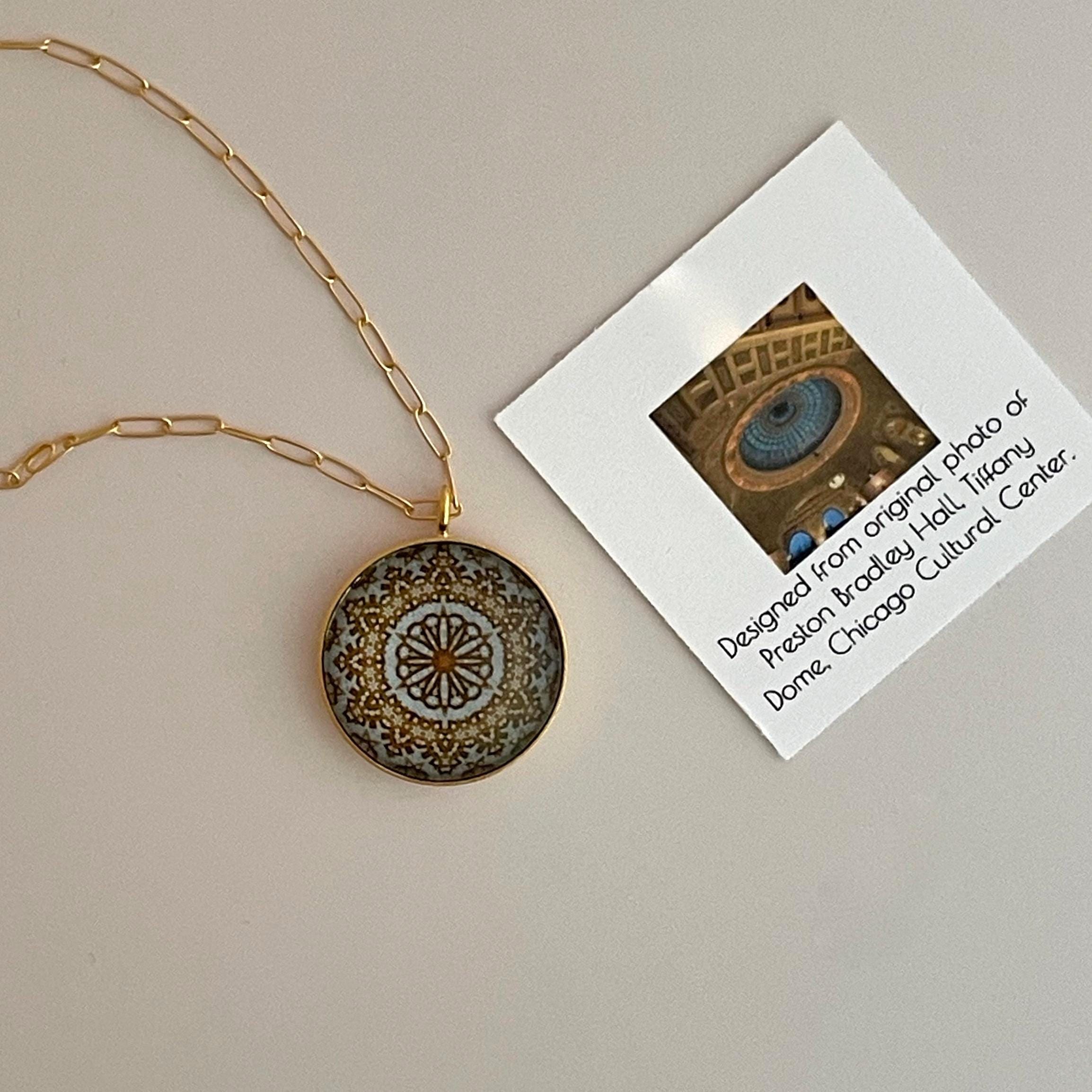 This classic necklace and earring design was created from an original photo of the Preston Bradley Hall Tiffany Dome in the Chicago Cultural Center. The magnificent translucent dome is 38' in diameter and is made of Tiffany Favrile glass, cut in the shape of fish scales. At the top of the dome are the signs of the zodiac. The dome glass, lighting fixtures, wall sconces and chandeliers were made by the Tiffany Glass and Decorating Company of New York. The supporting frame was constructed by the Chicago Ornamental Iron Company. Scroll through photos to see the stunning dome that served as the inspiration for these one-of-a-kind pieces.