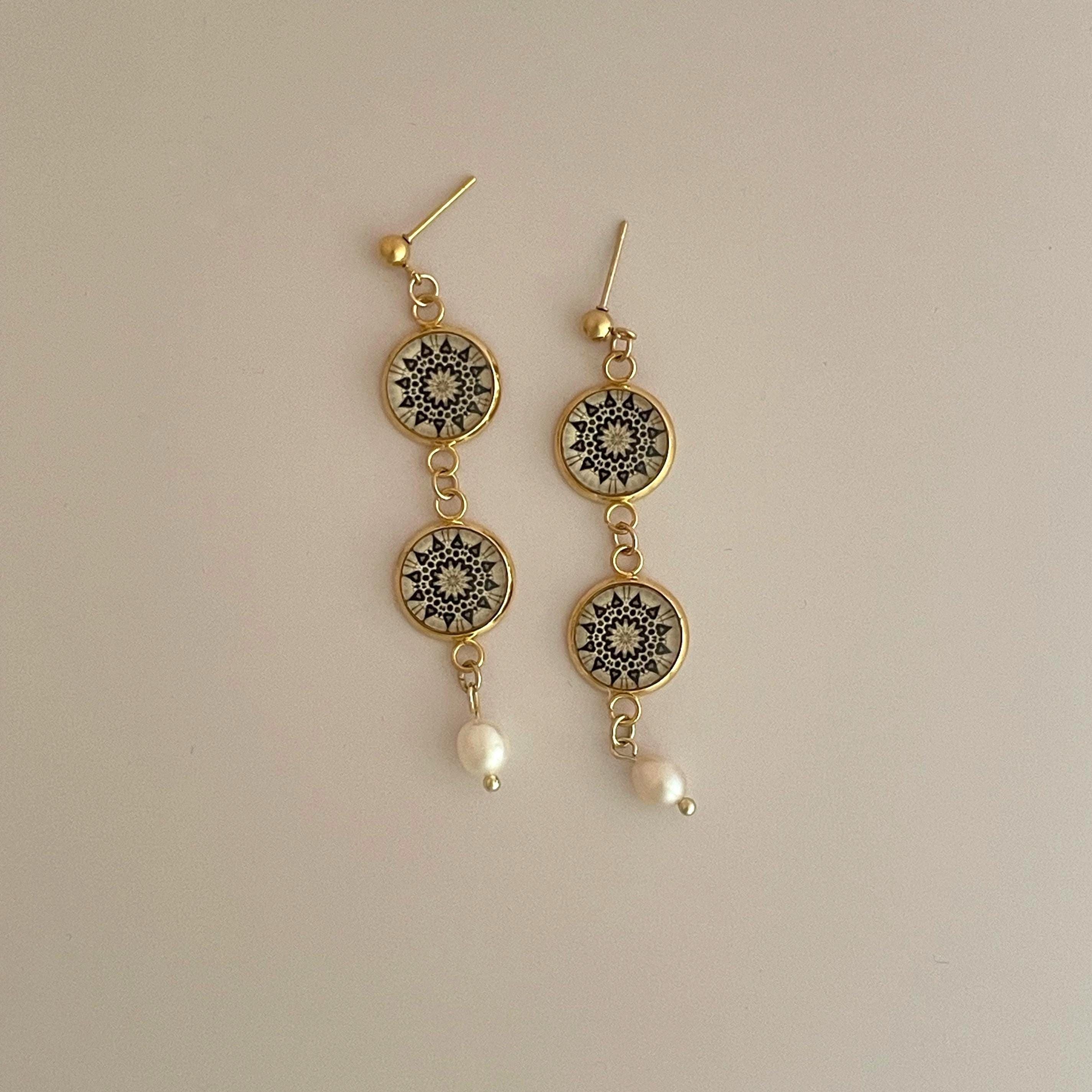 Stunning, double-drop glass and fresh water pearl dangle earrings. Very light weight. Each cabochon is approximately .50 inches. Total earring length is 2.5". This sophisticated design in subtle hues of ivory and black was inspired by and designed from an original photograph of the Baha'i House of Worship, Wilmette, IL. The temple is simultaneously awe-inspiring and serene. The architecture is striking with intricate detail incorporating symbols from many religions. The House of Worship is open to the public and used as a devotional space for people of any faith. It is one of the "Seven Wonders of Illinois" and is on the National Register of Historic Places.