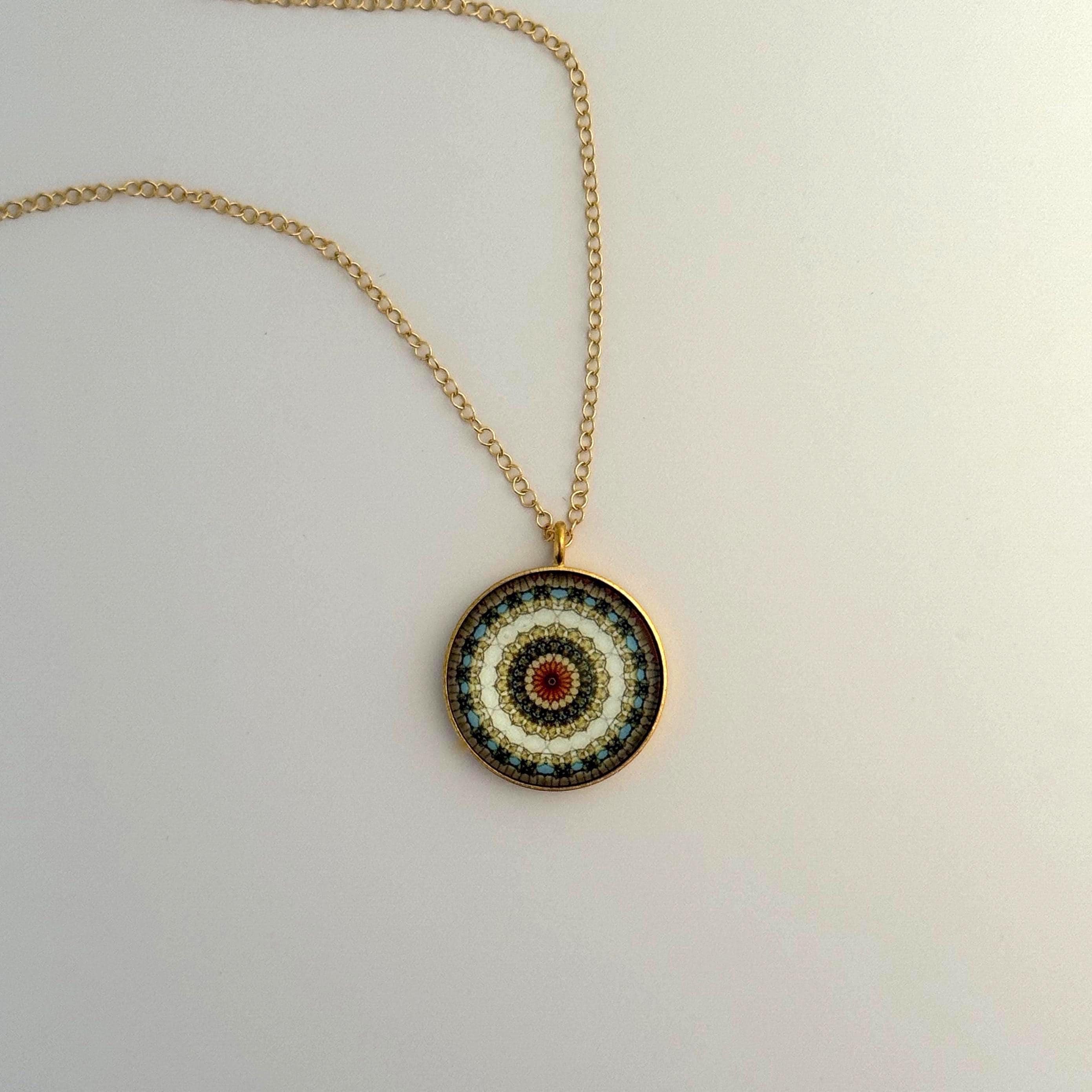 The necklace and earring design was created from an original photo of the glass dome in the Nickerson mansion (now Driehaus Museum) located on Chicago's Near North side. The dome was designed by Prairie School Architect George Washington Maher. Scroll through photos to see the stunning dome that served as the inspiration for these one-of-a-kind pieces.