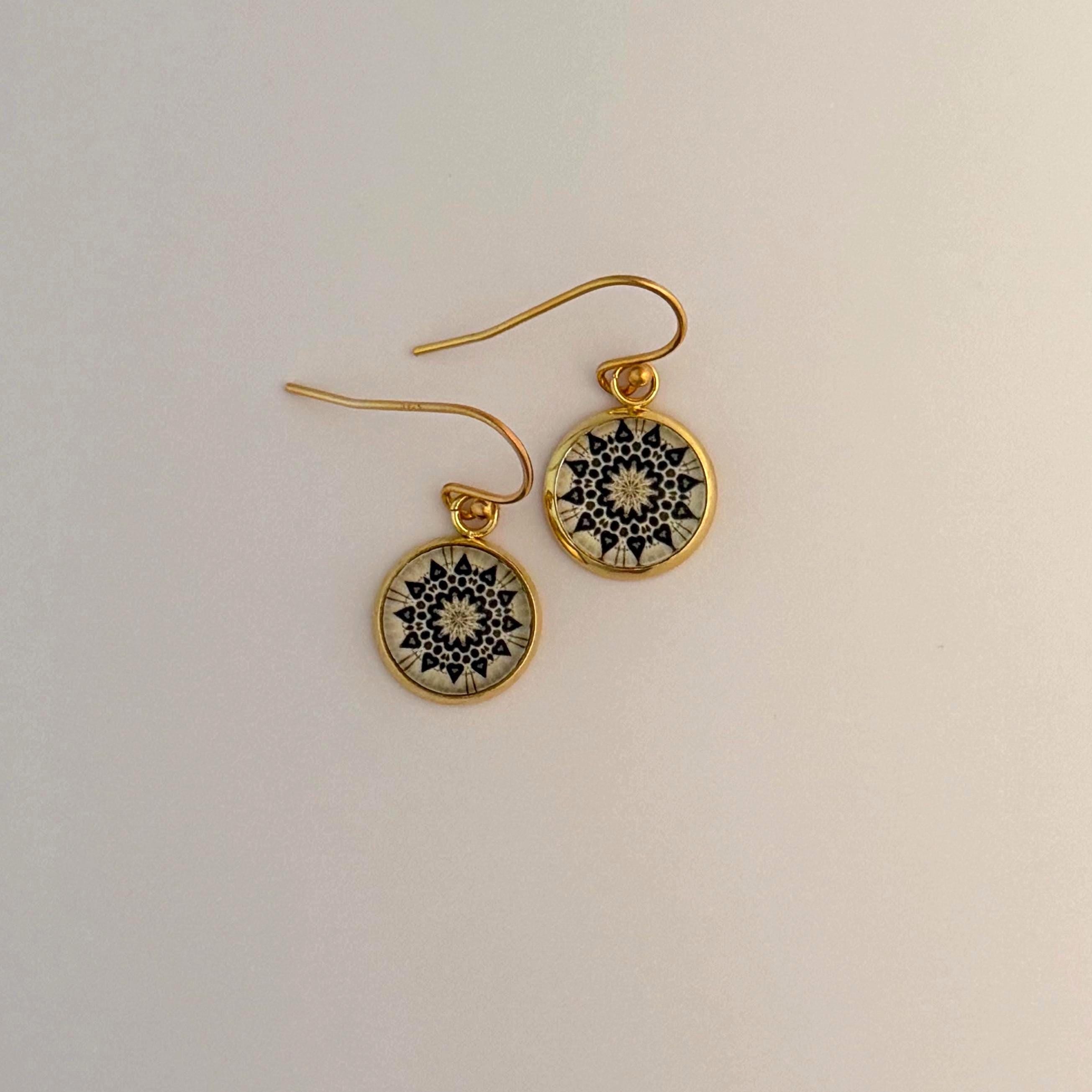 This sophisticated design in subtle hues of ivory and black was inspired by and designed from an original photograph of the Baha'i House of Worship, Wilmette, IL. Design is set on .5" glass cabochon on a gold-plated steel bezel with gold-plated silver french hooks with rubber backings. Total length approximately .75 inch.