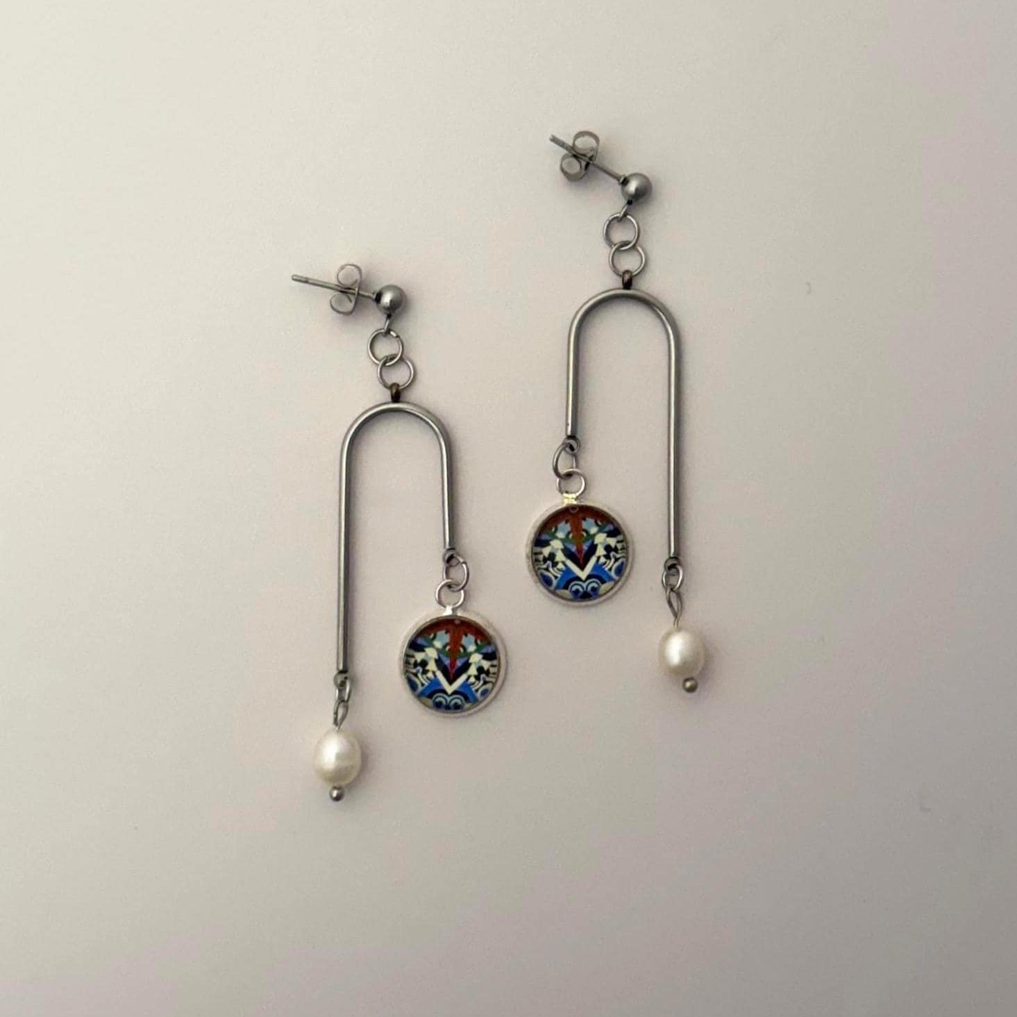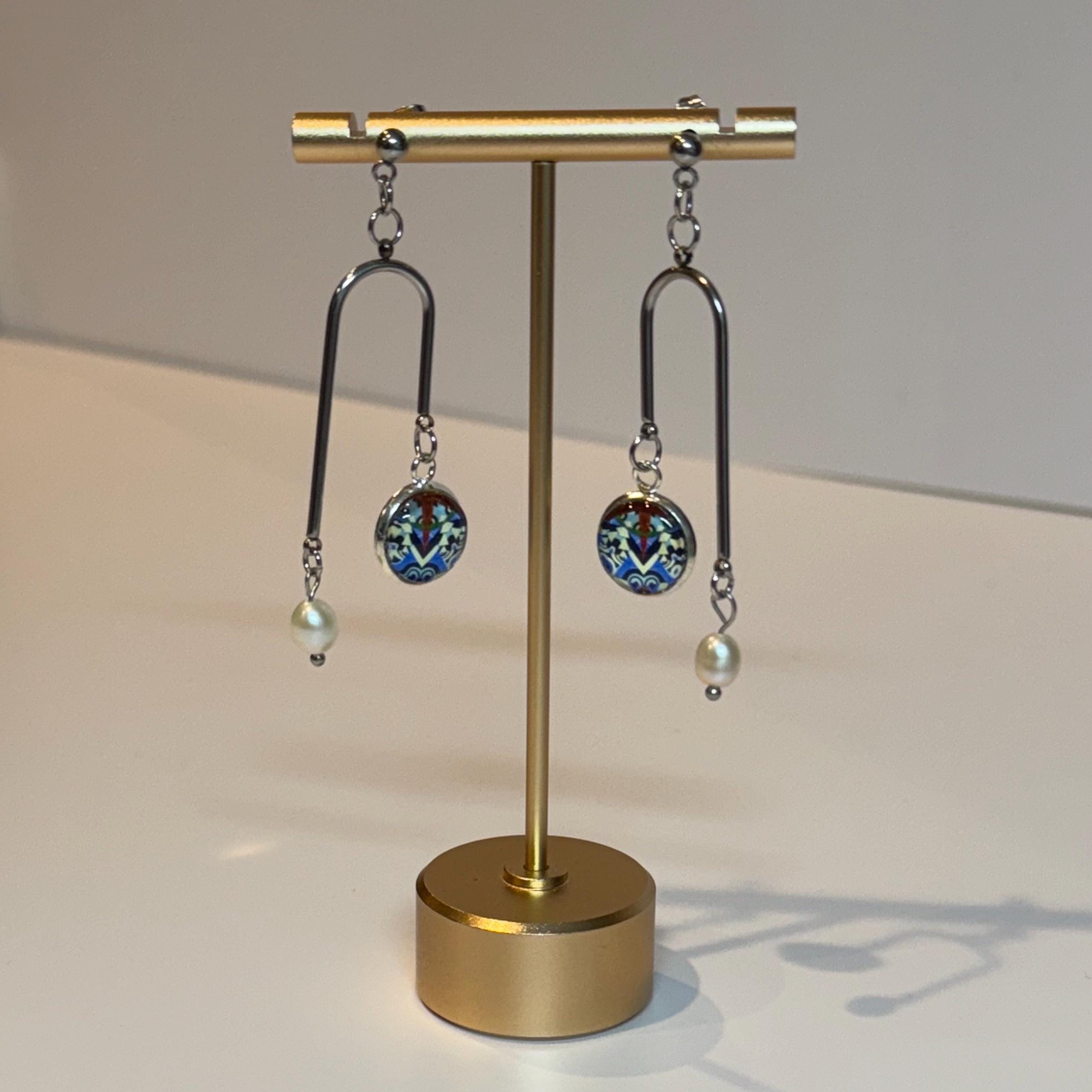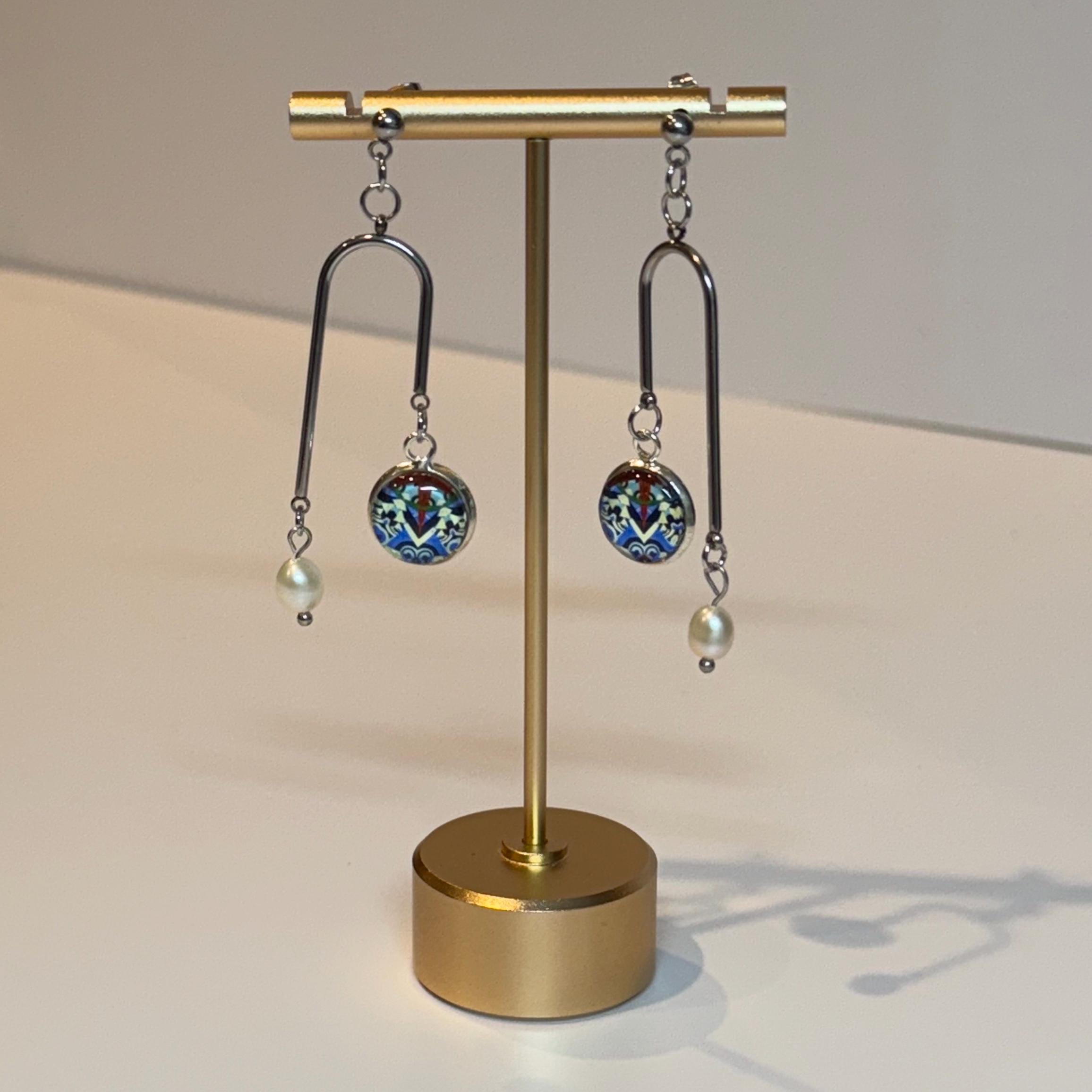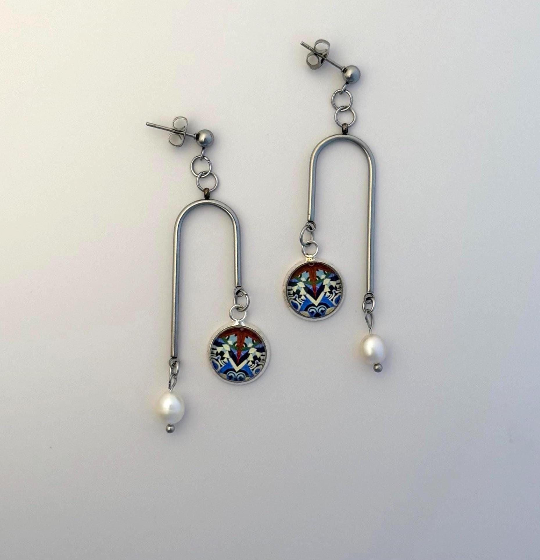 Stunning, chandelier earrings with 12mm glass and freshwater pearl charms set in steel. Total drop is approximately 1.6". These statement earrings with a bold, vivid design were created from original photo the "Bright Moments, Memories of the Future" mural by Mitchell Caton & Calvin Jones, which is painted on the exterior wall of the historic Avalon Regal Theater in Avalon Park/South Shore, Chicago.