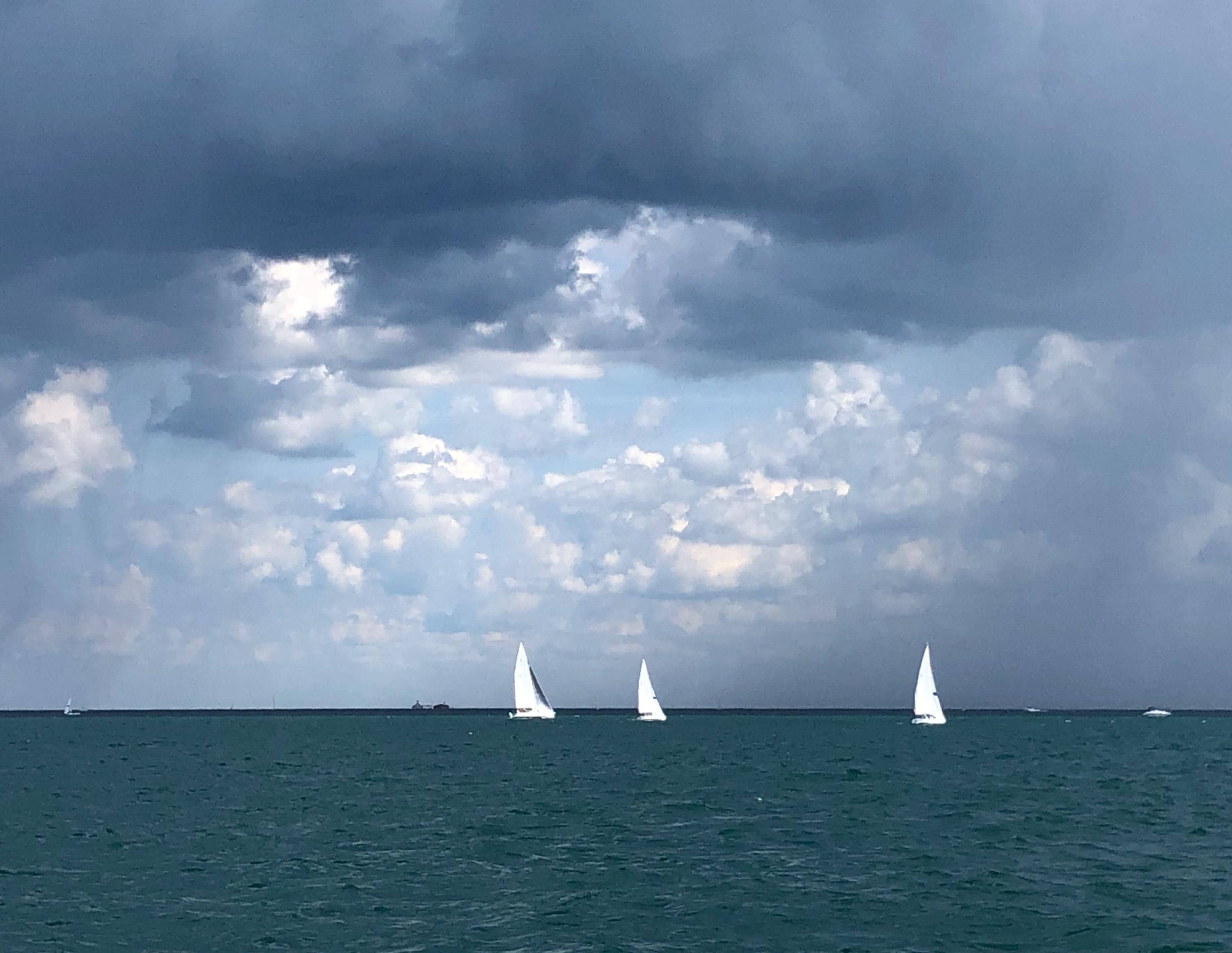 Stunning, chandelier earrings with 12mm glass charms and freshwater pearls on gold-plated steel. Total drop is approximately 1.6". These pieces are a work of art, individually designed from an original photograph of a squall over Lake Michigan.