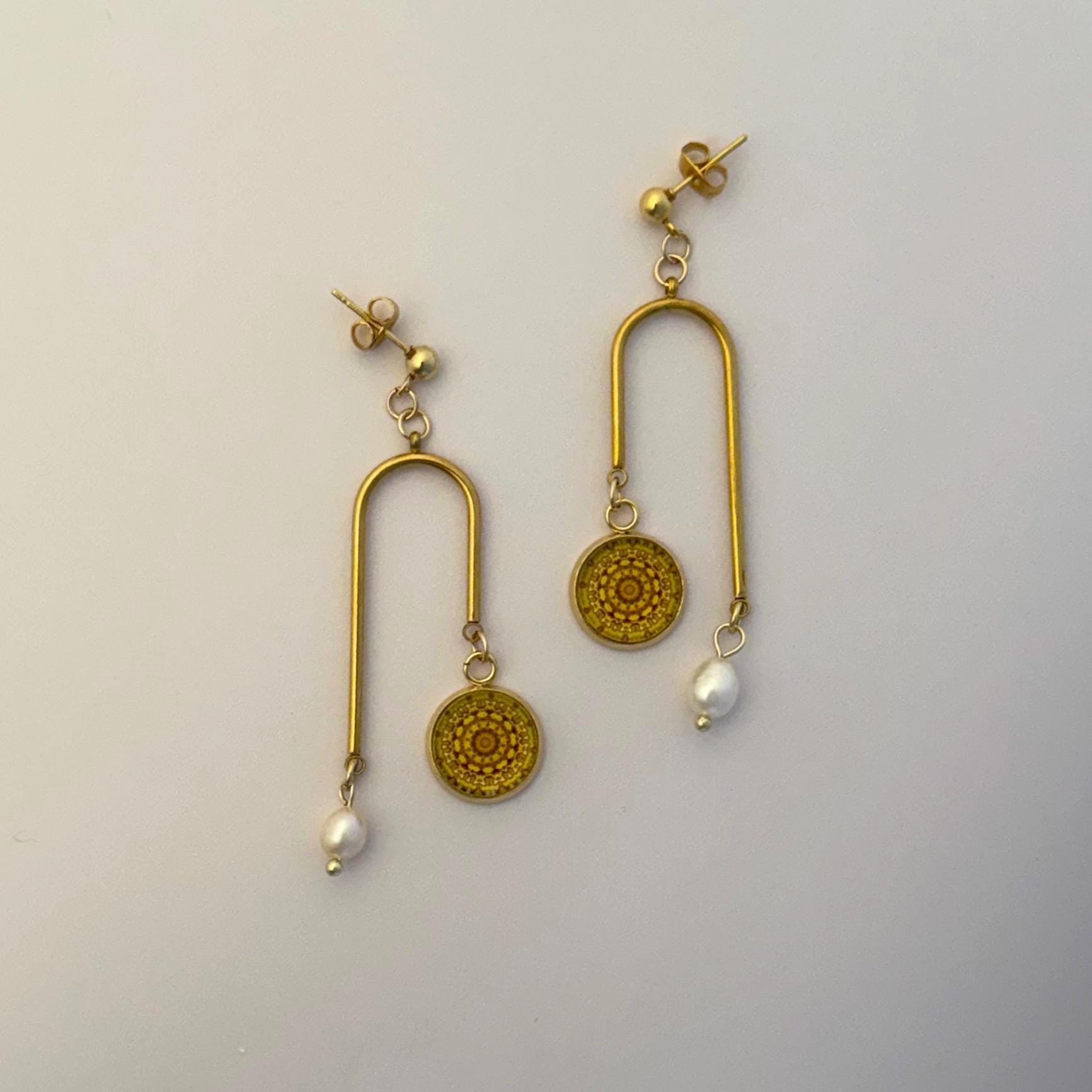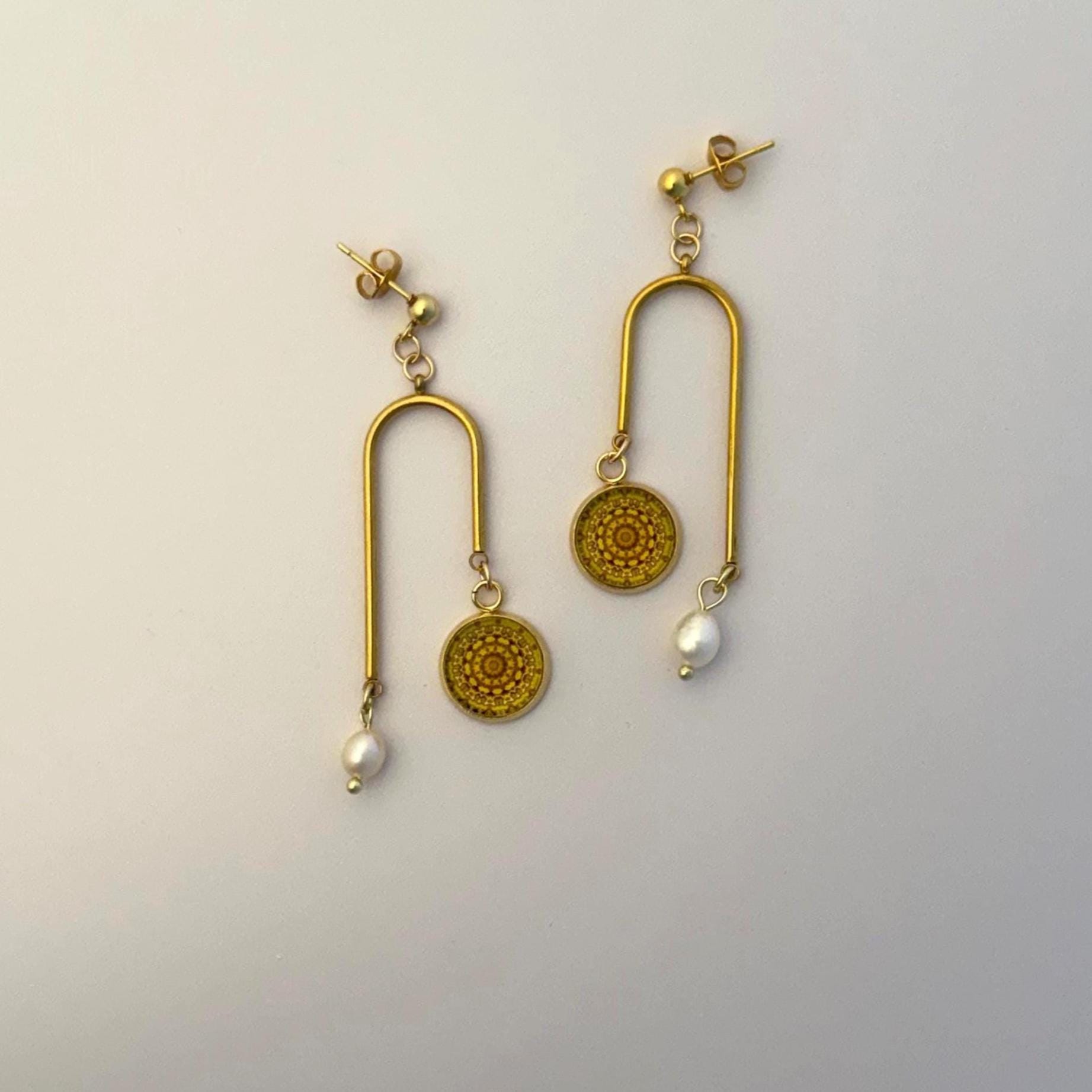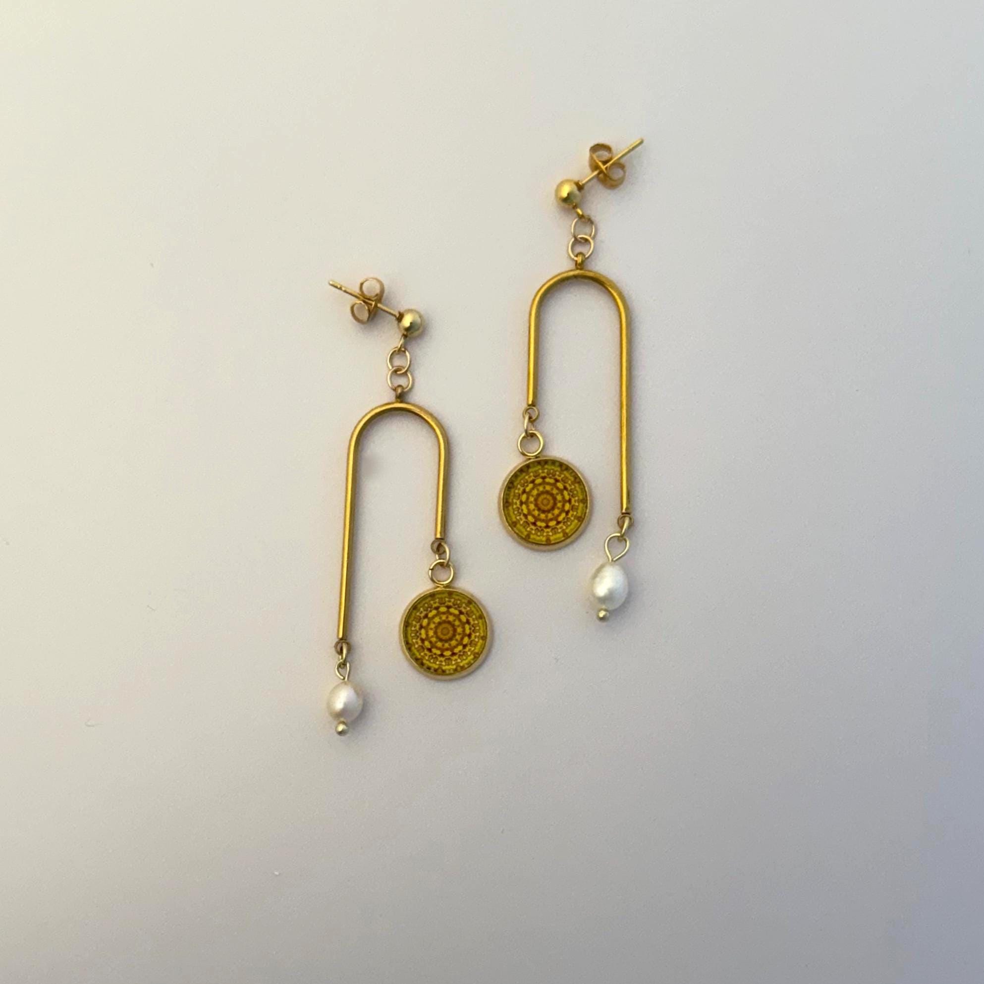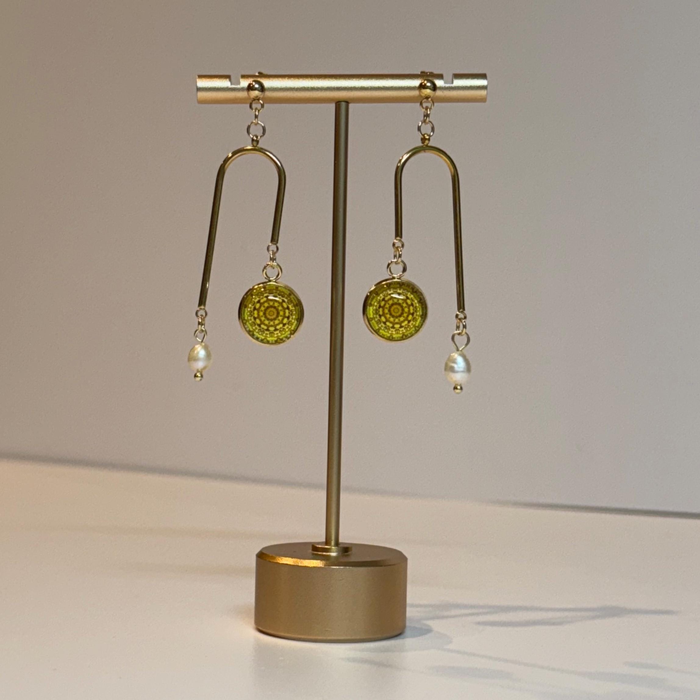 Stunning, chandelier earrings with 12mm glass charms and freshwater pearls on gold-plated steel. Total drop is approximately 1.6". These pieces are a work of art, individually designed from an original photograph the glass Tiffany dome in the Grand Army of the Republic Memorial Rotunda of the Chicago Cultural Center. Scroll through photos to see the stunning dome that served as the inspiration for these one-of-a-kind pieces.